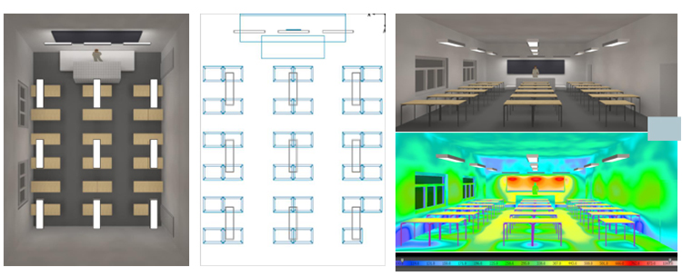 通过专业的软件,我们做出来一套非常完整的布灯图,这些布灯图都是根据我司专用的LED护眼专用教室灯的产品才能达到如图的效果